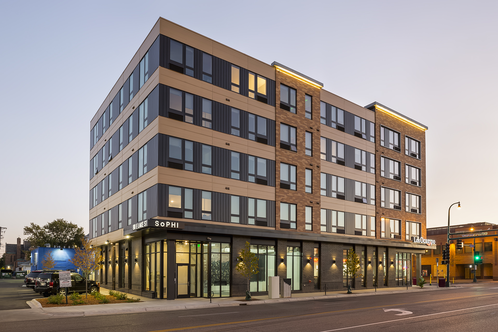 For this 5-story, 48 unit apartment building located in South Uptown neighborhood of Minneapolis, Nordstrom Metal installed three colors of vertical and horizontal 1/8″ flush seam panels.