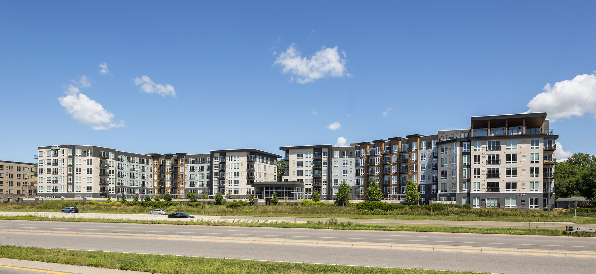 Nordstrom Metal installed flush seam wall panels with minor ribs and fabricated panels with Elevate’s 22ga metal material for this 5-story, high-end apartment complex in Golden Valley, Minnesota.
