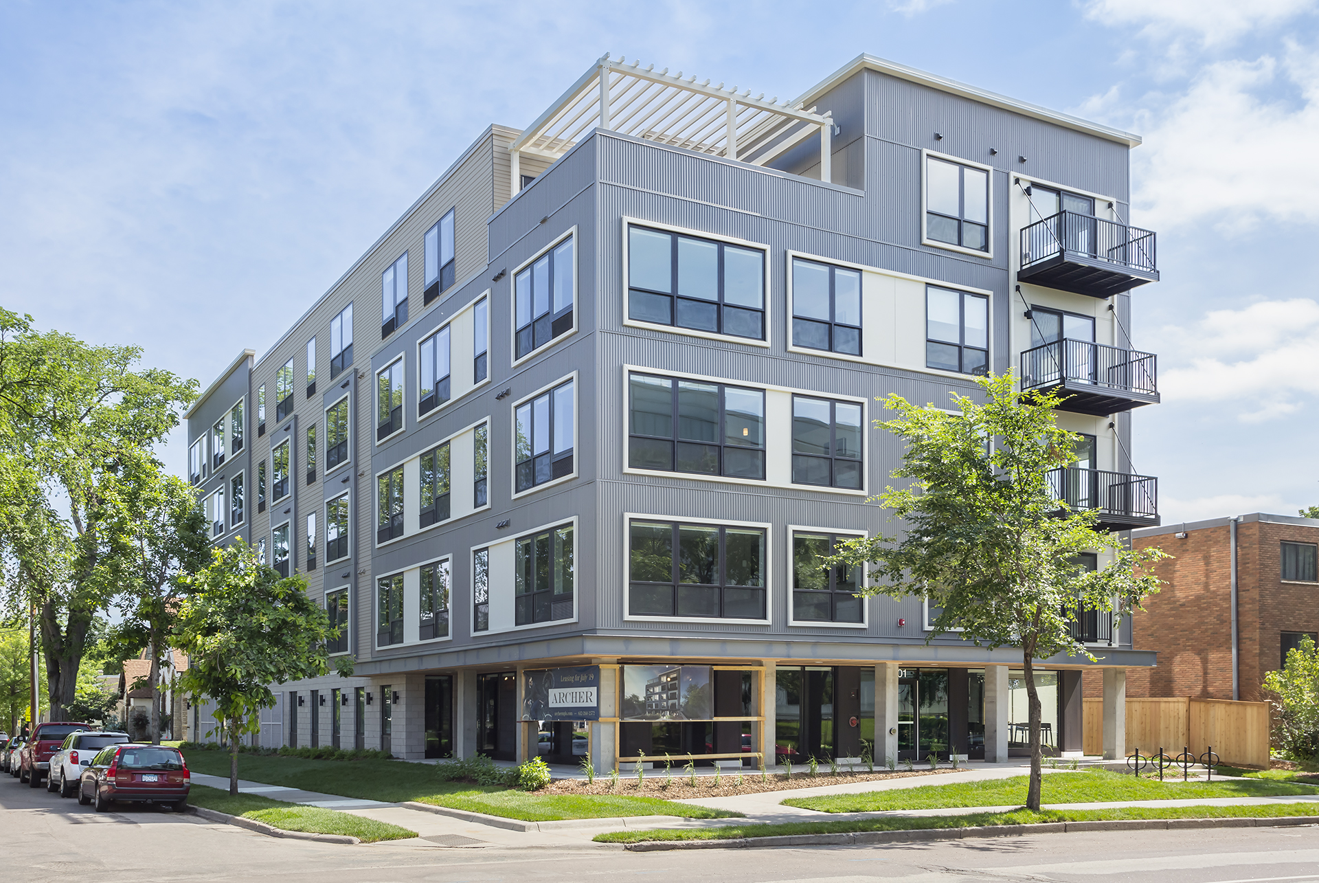 Completed in 2019, Nordstrom Metal custom fabricated and installed the exterior facade of Archer Apartments, finished with corrugated metal panels, metal window framing, soffit panels, lap siding, flush seam panels, and aluminum balconies on either end of the building.